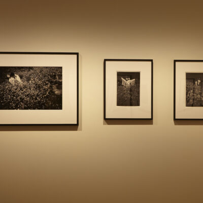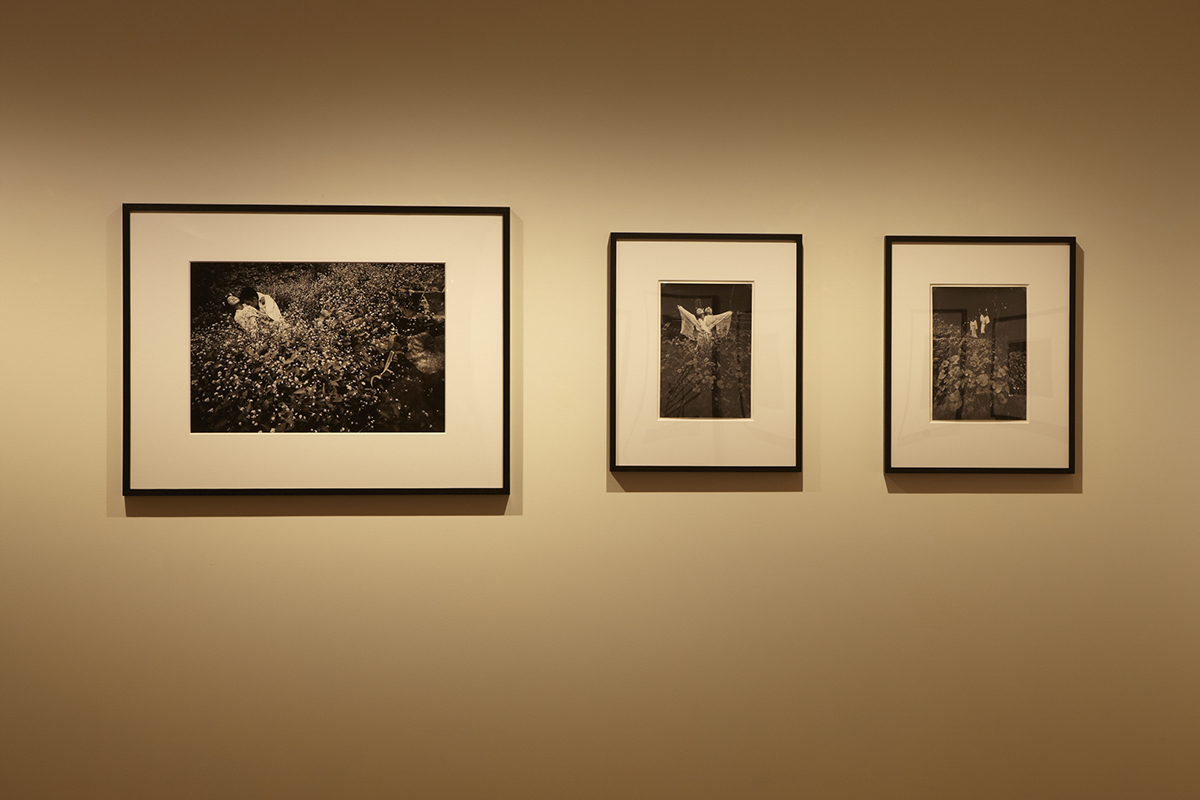 “鎌鼬”とは小さなつむじ風の中心部が真空状態になり、そこに触れた皮膚に突然鎌で切られたような傷ができる現象を指し、両腕に鋭い鎌を持ったイタチに似た妖怪として伝えられています。舞踏家 土方巽を被写体とした「鎌鼬」は1965年より撮影を始め、土方の故郷である秋田に加え、東京の柴又、巣鴨など、戦後の細江の軌跡を沿うような場所にまでも撮影地を拡張し、1969年に写真集として刊行されました。撮影は、自らの原型を故郷に見出そうとしていた土方に鎌鼬のイメージを重ね、また細江自身が忘れかけていた山形における疎開時の体験を、「東京での生活の戦後の体験と疎開の体験、そして焼け跡、今の経済繁栄、そして、この平和、このままどこへ行ってしまうのだろう」(「細江英公に聞く」、『季刊写真映像』1号、1969年)という思いのなかで確認しようとする行為でもありました。東北の血と風土を共有する土方の肉体を媒体として「私の『記憶』を『記録』する」(細江英公「鎌鼬」、『写真・細江英公の世界』、写真・細江英公の世界展実行委員会、1988年)、被写体との関係性から紡ぎ出された物語性の強い作品となっています。