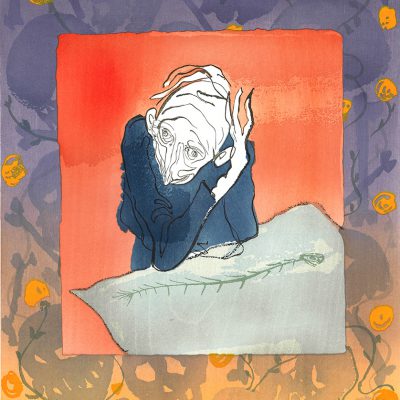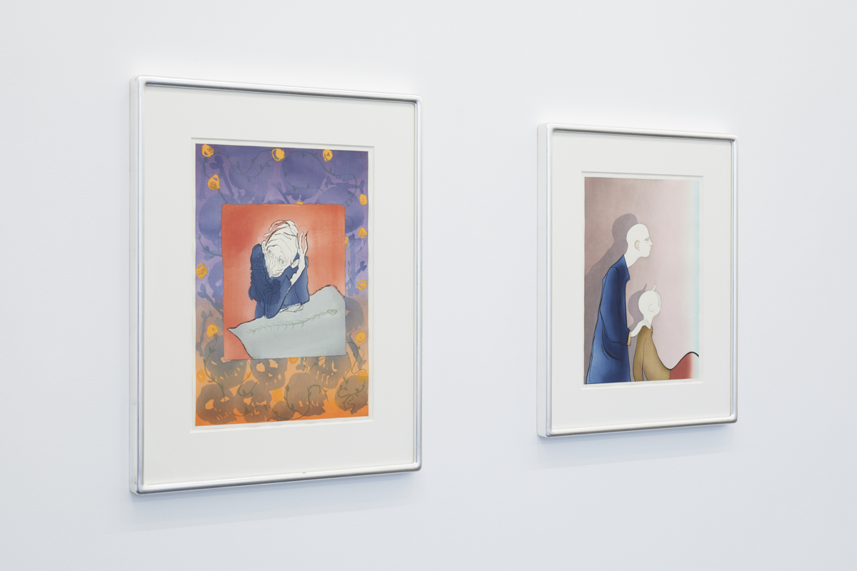 本展のため、カンタロフスキーは日光のトレッドソン別邸に1ヶ月滞在し、インクと水彩による素描シリーズを制作しました。今回発表する木版画作品は、このシリーズを基にアダチ版画研究所がその優れた技術により制作した作品です。歌舞伎や能を基にした江戸時代の浮世絵の伝統に倣うように、カンタロフスキーのイメージ群は演劇性に満ちています。歌川国芳ら大家の作品を念頭に置きつつ、服の裾からのぞく裸足や、惨劇を無関心に見つめる海鳥、大人から抑圧的な扱いを受ける子どもといった特定のモチーフを通じ、作家は風刺的で不穏なイメージ作りの伝統を参照します。何度も色版を摺ることで線と色の層を重ねるという極めて繊細な工程を通し、これらの触覚的な主題が紙の上に現れます。