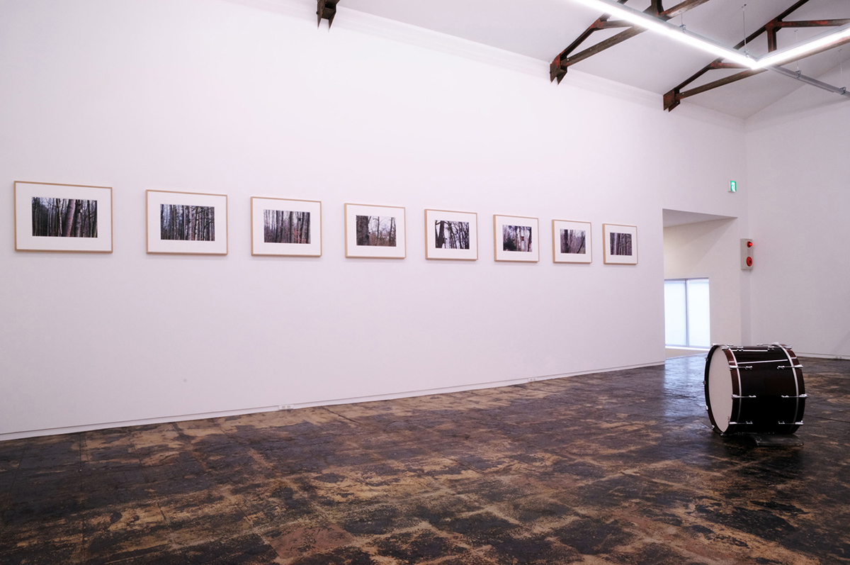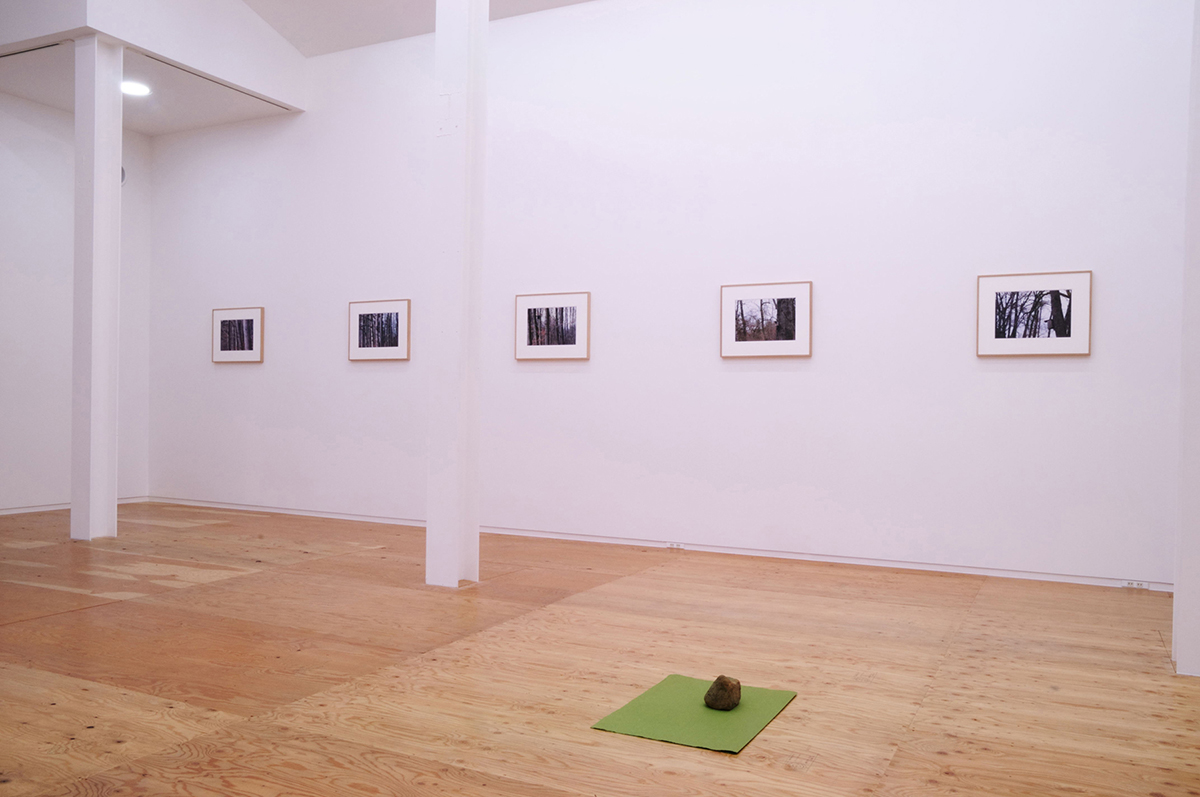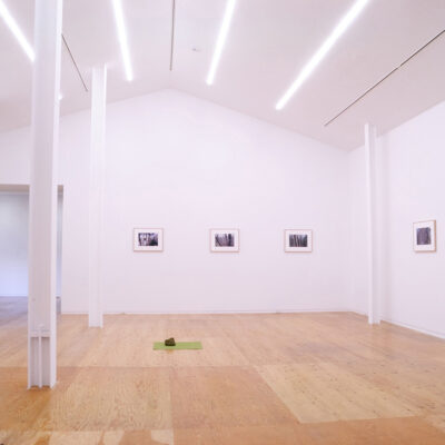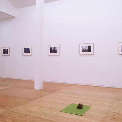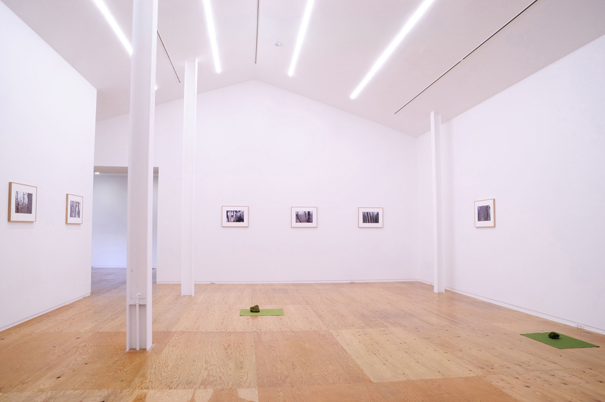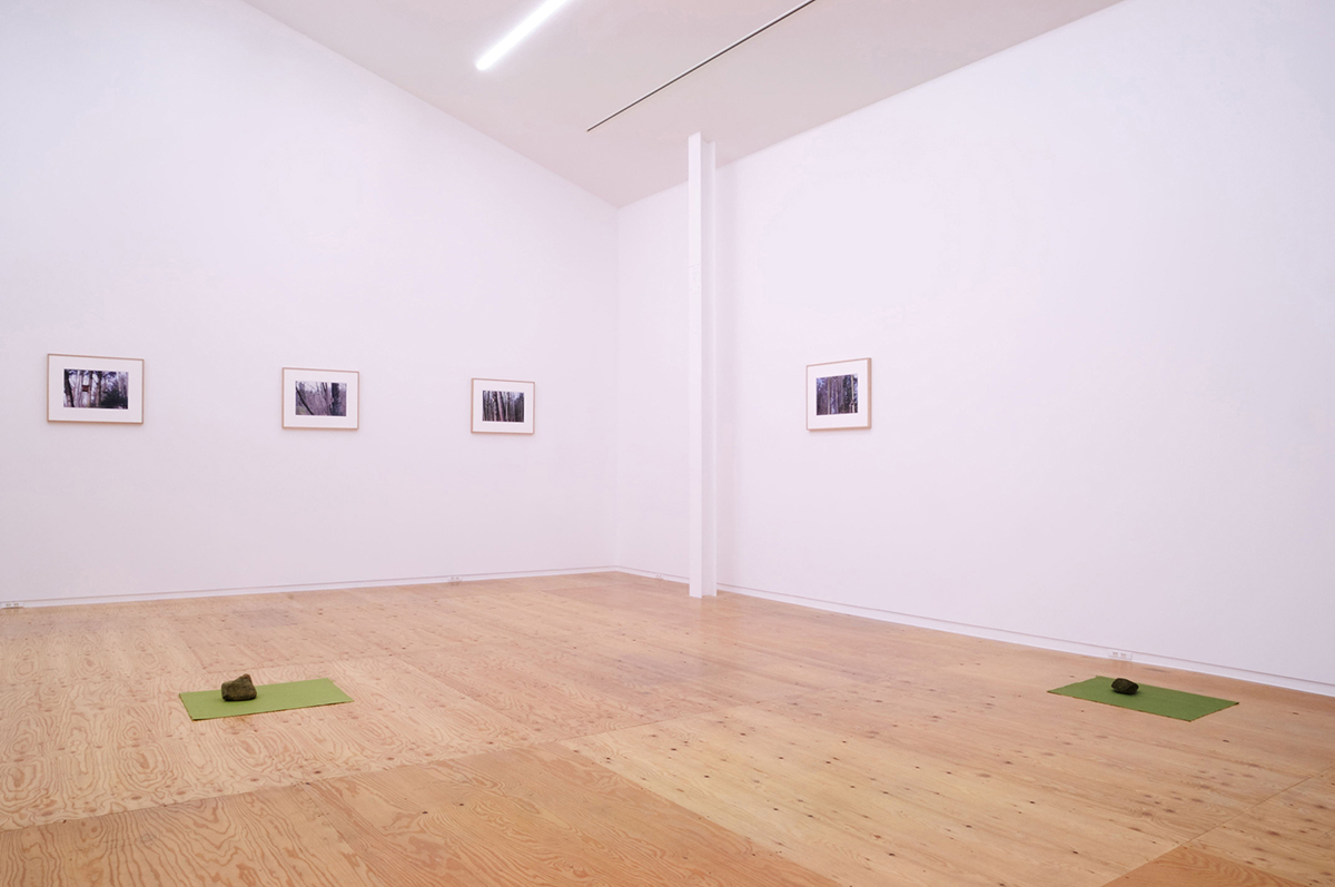 Helen Mirra’s exhibition consists of a series of 18 color photographs. There are nine images, and each image has been printed twice, once in reverse. The informal photographs are of trees in the woods with a birdhouse among them. The exhibition is in both spaces of the gallery, with each photograph out of sight from its mirror image.