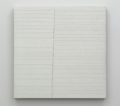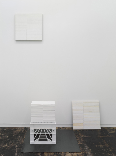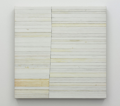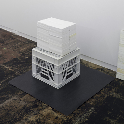 “Relaxation Sensation”, the title of Jon Widman’s show, is comprised of four paintings, multiple drawings, and a sculpture. The new body of work explores the space between tension and tranquility. The drawings and paintings invoke a contemplative, untroubled state by continuing the consolidation, rearrangement, and reexamination of information and images from his personal collection of books. The painting and sculpture of stacked books examine the meditative quality of book pages shown minus words which can disturb.