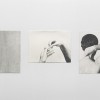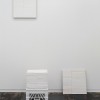 The small painting and sculpture both act as thoughtful, reflective moments in the show. The painting titled “Pages #2”, shows stacks of paperback books in shades of white with hints of color from the cover or back pages, as well as black from the space between the books. The repetitive pages represented by the shades of white create a quiet tension. The sculpture titled “Alter” is composed of a 30”x30” piece of paper completely covered with black graphite, a milk crate, spray-painted white centered on top of the paper, and a stack of carefully chosen books also painted white. The blackening and whitening of the various components strips the sculpture of its original content and renders it neutral, making a kind of even-handed and serene statement.