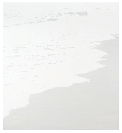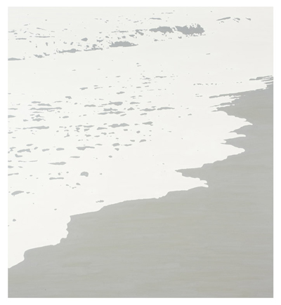 The three large paintings, titled “Ripples” and installed side by side, begin with a highly saturated image of a beach scene. The other two paintings of the same exact image slowly become more blurred through value changes, creating “a ripple effect” where one event produces further events.