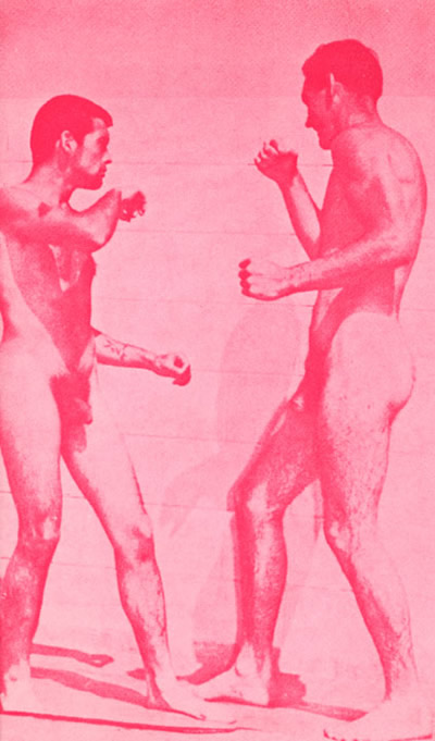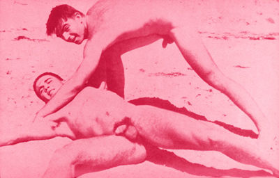 Taka Ishii Gallery will exhibit Sameshima’s series, “Young Men At Play,” a set of 13 color photographic prints. Exhibited images were originally published in amateur magazines illegally distributed in America ca.1960’s. The exhibition is modeled formally on these publications: images included in the original publications were likely themseleves “appropriated” from a variety of pre-existing sources, all exhibited images are printed in monochrome -in the fashion of the original, inexpensively produced one-color publications. In addition to exhibited works, Taka Ishii Gallery will co-publish and distribute (with Peres Projects, Los Angeles) a free-paper exhibition catalogue. The exhibition and catalogue distribution themselves constitute an outlaw act given exisitng censorship laws in Japan and the current conservative political climate in the United States. This recent body of work is motivated, in part, by the artist’s will to assert and examine the continued existence of underground culture as one amongst multiple “gay cultures”.