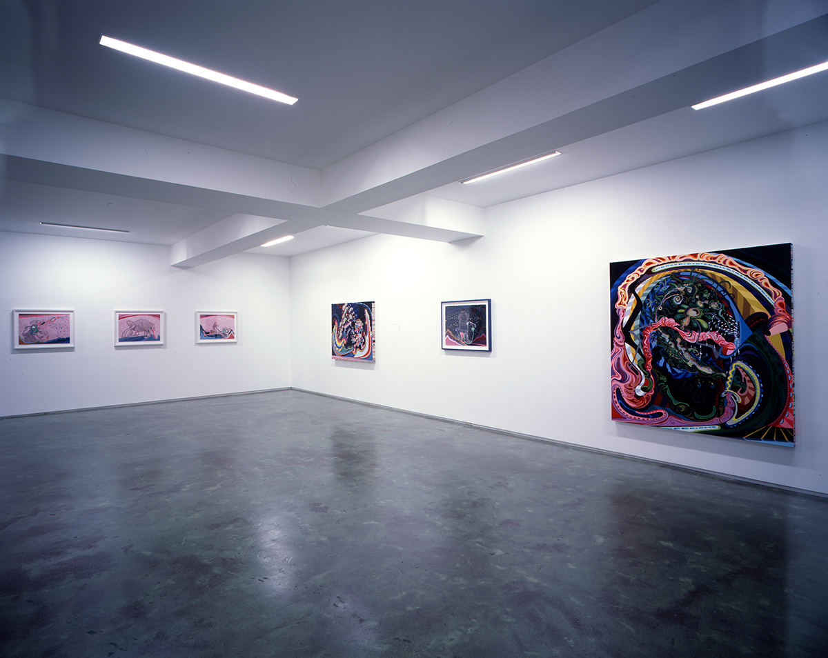 The present exhibition represents a further development in Erik Parker’s work. While including a selection of paintings, the show is largely comprised of painted works on paper, signaling a shift in the artist’s practice towards a less constrained aesthetic. Words are re-introduced in the drawings, though in the work text serves in a new, expressive capacity. Attempting to re-place himself within a changing cultural environment – his (art) world of 2006 is vastly different from that of 1999, the year of Parker’s debut – Erik has adopted a free-form style, influenced by sources as diverse as space-rock and Mayan culture, to further investigate the place of his painting within the present. The exhibition’s title Half Cocked expresses both the anxiety and bravado co-existing in this new body of work.