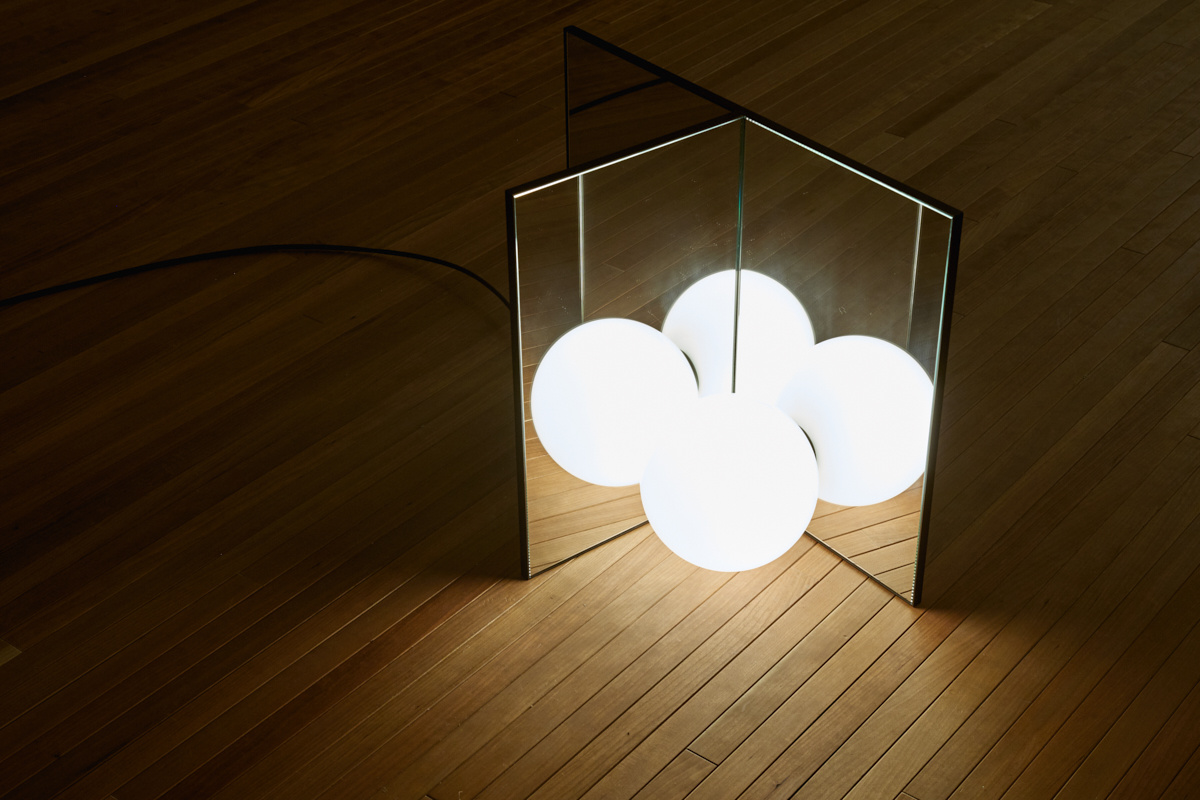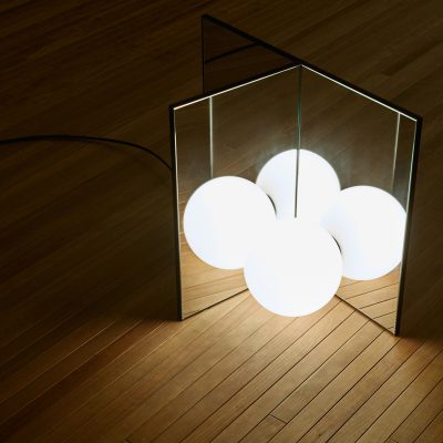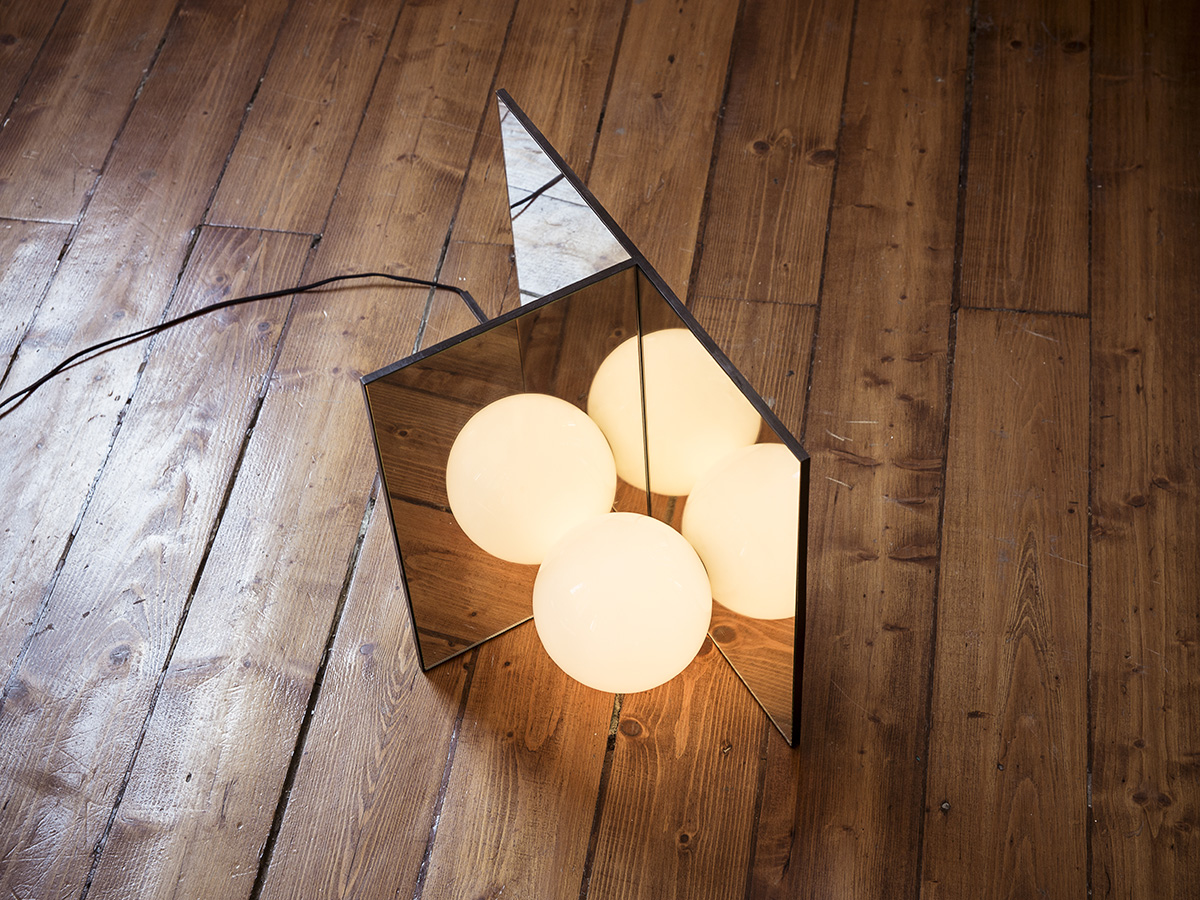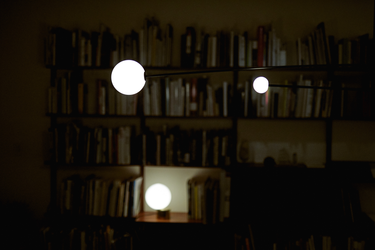 Anastassiades is interested in how lighting exists in two realities: being on and being off. When off, the lighting shown as an object, a visual element that occupies the space; communicates its materiality, reflectivity, fragility and volume. And when on, this glowing source fills a completely different space within the room, engaging on the relationship between all the objects around it, as it gets the shadows casted on other objects against the wall.