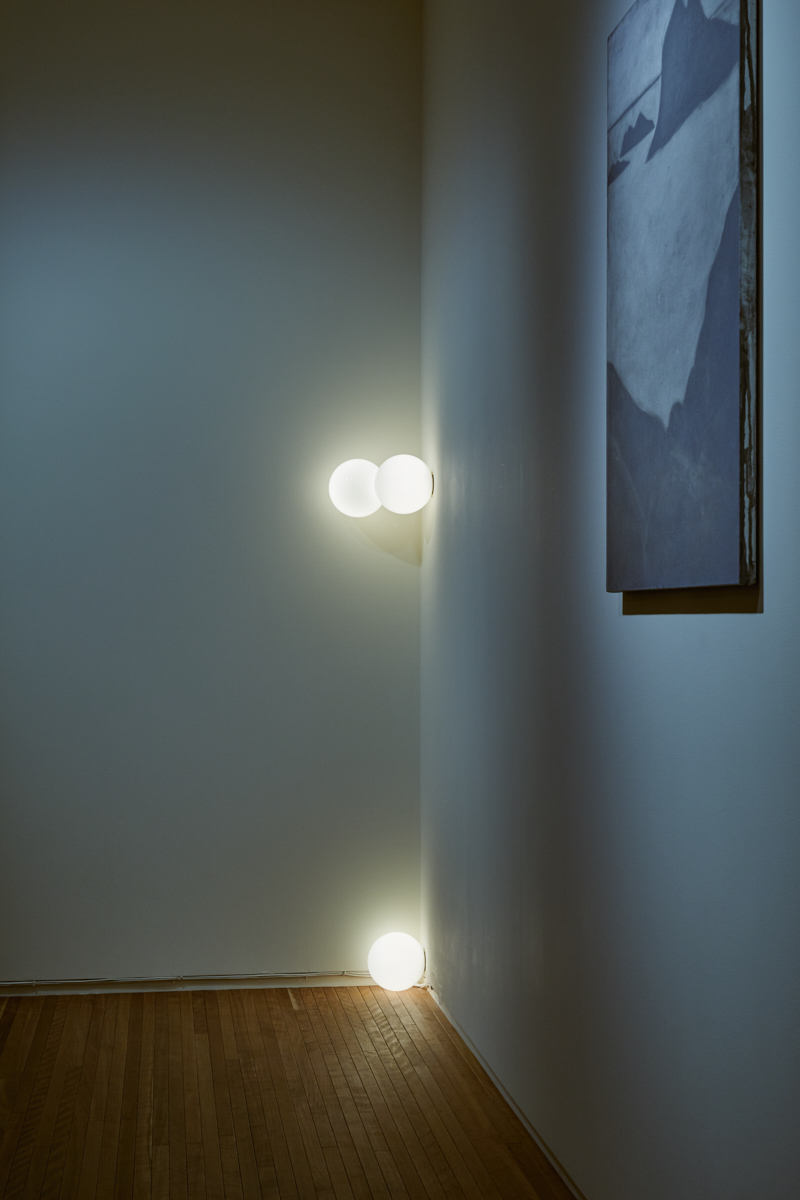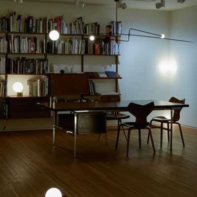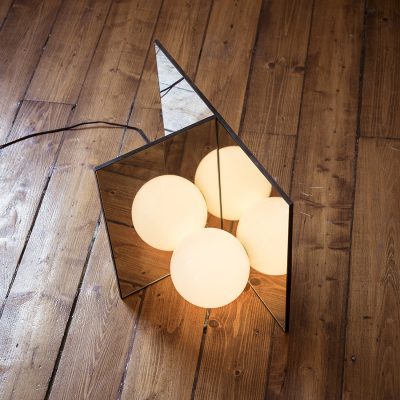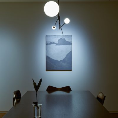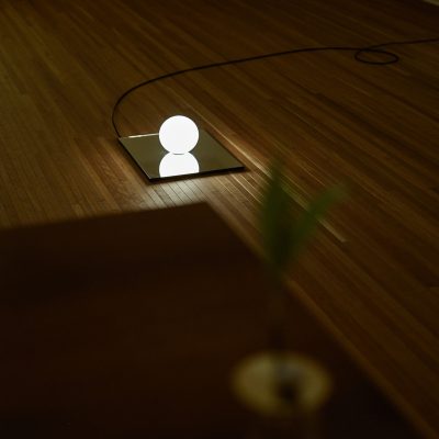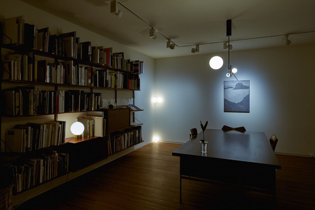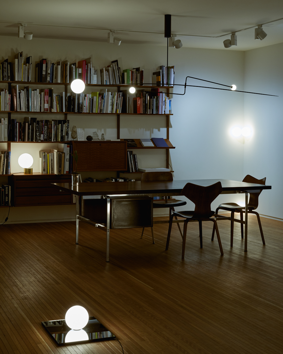 Anastassiades is interested in how lighting exists in two realities: being on and being off. When off, the lighting shown as an object, a visual element that occupies the space; communicates its materiality, reflectivity, fragility and volume. And when on, this glowing source fills a completely different space within the room, engaging on the relationship between all the objects around it, as it gets the shadows casted on other objects against the wall.