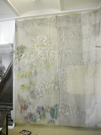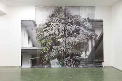 The embroidered piece “between tree, ghost has come,” is in direct contrast to the piece “To remember grandmother’s room,” presented in Takemura’s solo exhibition “for dearest You” (Taka Ishii Gallery, Kiyosumi, Tokyo, 2004). Within the piece presented in 2004, Takemura focuses on her maternal grandmother’s room, however, the new piece centers itself upon the tree which stands between Takemura’s paternal grandmother’s house and her family home. Through the overlapping image and embroidery, Takemura summons within the viewer, a space which had existed in a different environment, and the memories which drift amidst it.