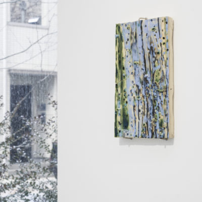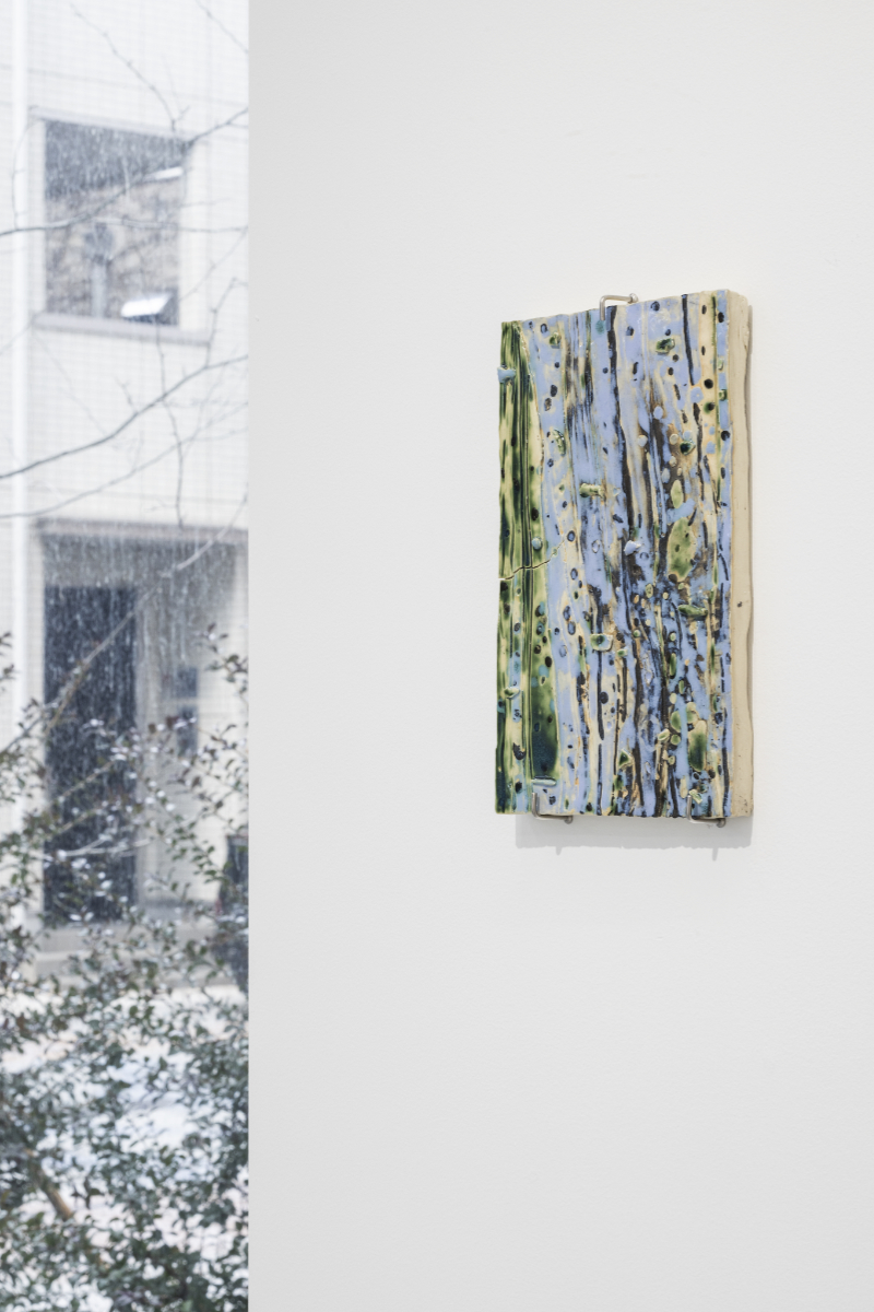 Reika Takebayashi was born in 1998 in Osaka Prefecture and lives and works in Kyoto Prefecture. She graduated in 2020 with a BA (major in oil painting) from Kyoto University of Art and Design, and completed her master’s degree (MFA) in the same field at Kyoto City University of Arts in 2022. Takebayashi observes natural phenomena in her surroundings, such as the glimmer of light on a brook’s rippling surface or patterns on the surfaces of rocks, and produces paintings featuring irregularly undulating lines, shapes, and color fields that interact and generate movement across the canvas. Layers of brushwork suggest the transient nature of time, inviting viewers to look beyond the confines of the canvas as if peering through a window onto a faraway scene. Alongside her paintings, this exhibition presents ceramic tile works made in her Kyoto studio and kiln-fired at the Shigaraki Ceramic Cultural Park. Her experimental approaches to shaping clay and applying glazes result in works conveying active engagement with the unpredictable and hard-to-control outcomes inherent in the creative process.