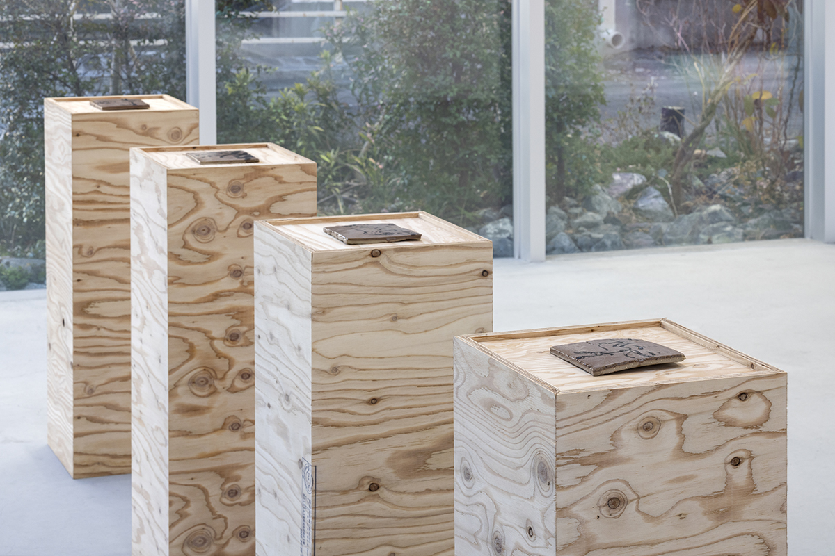 Engaging closely with various elements embedded in folk crafts has shaped Nagasawa’s painting in ways that extend beyond simple incorporation of motifs or juxtaposition of multiple axes of time on the canvas. His insights derived from this process have been absorbed into the act of painting itself. This effort to deepen the dialogue that takes place as he paints is also reflected in his reinterpretation of the relationship between figure and ground. Nagasawa’s earlier paintings are characterized by color fields with distinctive textures produced through the use of woodblocks, as well as by unpainted areas of cotton canvas. In the new works, he adopts a different method, layering small, restrained strokes made with limited amounts of paint and building up large compositions from these accumulations. Slight differences in color that arise from frequently mixing pigments anew appear on the canvas, together with bleeding and scraping, as subtle shifts that emerge naturally from the artist’s gestures. The small ceramic tile works shown alongside the paintings are made using clay sourced from Korea, evoking and restaging the long history of exchange between the peninsula and Japan since antiquity.