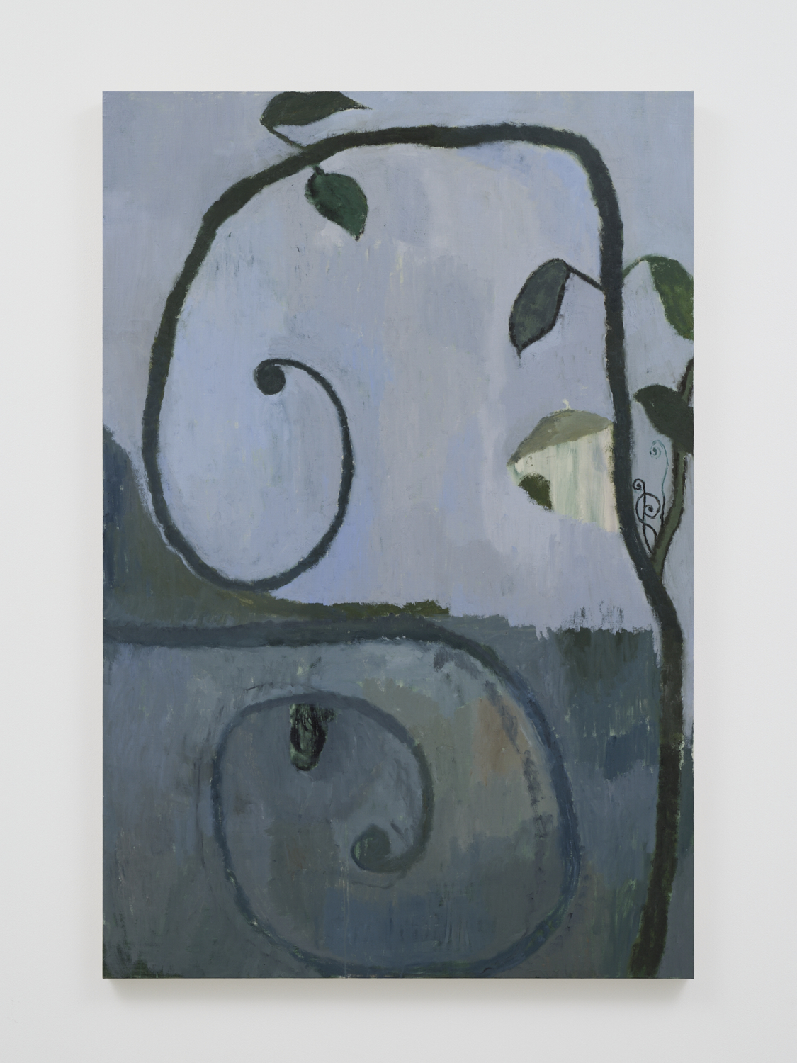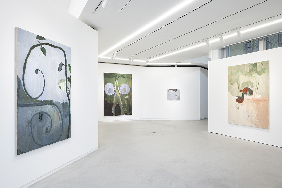 Nagasawa regularly visits flea markets near his studio in Kyoto, and produces paintings that reference motifs found in folk craft objects. At these markets, where handmade objects from different periods intermingle, his attention is drawn not only to varied depictions of plants and animals, but also to patterns, calligraphic elements, and other symbolic or abstract forms. Imbued with singular qualities imparted by the hands of anonymous artisans, as well as slight differences that have emerged by chance in individual objects, these visual forms have gradually evolved over long spans of history, surviving amid drastic changes in their surrounding environments and remaining woven into everyday life up to the present. A motif that runs throughout the works in this exhibition is the arabesque pattern, which originated in ancient Mesopotamia and Egypt and reached Japan by way of China. Nagasawa speaks of being drawn to the way arabesque forms spread across regions, shedding elements and undergoing gradual reduction to symbols. In his paintings, vine-like forms occupy the picture plane as if creeping across it, held in a suspended state between linear rendering and abstract form.