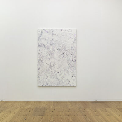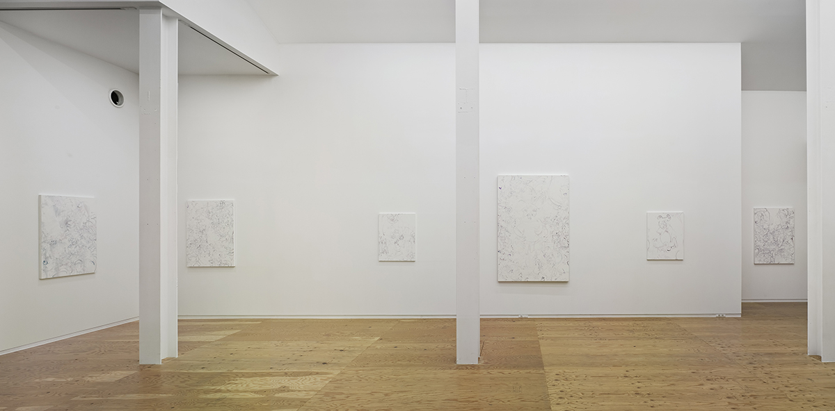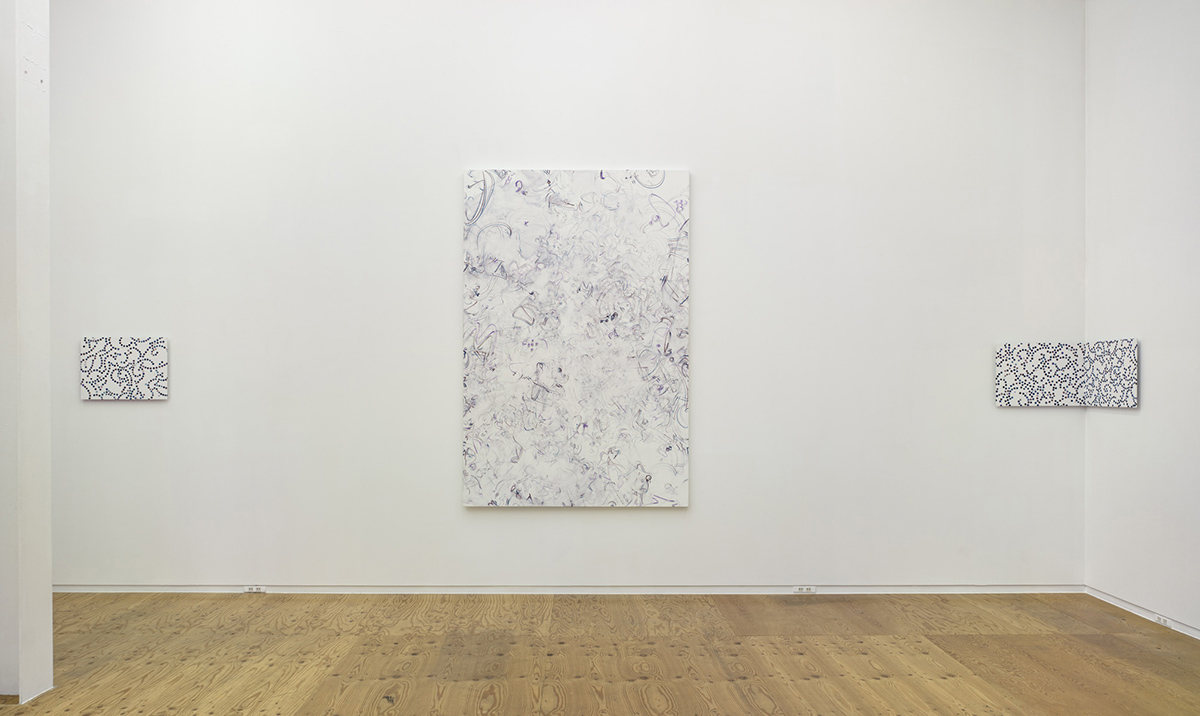 描いていくうちに、たとえ1本であっても白場より奥に線を描くことができれば、いくら描き込んだ絵であってもそのつくりはガラッと変えられるということに気づくようになりました。自分の制作にいま一番かかわりの強いこの線のうちの1つに「画面の外からの力を描く」線と呼んでいるものがあり、描き込むことで絵の中の線同士の関係を複雑にした上で、この線によってさらに白場と線という関係も以前のものと大きく違うものになるように作品を進めています。