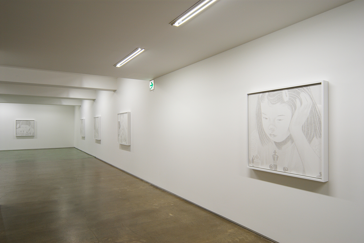 「プレイヤーズ・ヒストリー」と名づけられた新作のシリーズは、フレームされたキャンバスに描かれた8点のパステル・ドローイングからなります。本展は、アドラーのキャンバス作品による2度目の展示となりますが、それ以前の個展においては、アドラーは写真からドローイングをおこし、それをふたたび写真に撮影し、ユニークのカラープリントとして展示する独特の手法を使っていました。