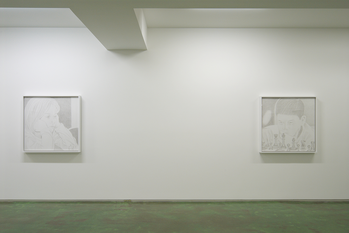 初期の作品に見られるアドラーの作品は、ファウンド・フォトを使用しています。たとえば、明るいグレーの色調で描かれた、対戦相手のいないチェス・プレイヤーのイメージは、有名無名のアマチュアのチェス・プレイヤーの写真を引用しています。描かれるキャラクターは、軽やかに見えながら執拗な印象を与え、「写真」と「ドローイング」をめぐる作家の思考を示唆し、同時に作家のポートレイトでもあるのです。
