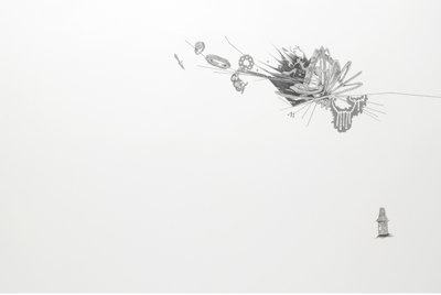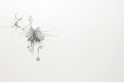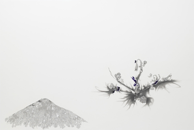 大きく残された余白と対峙されて、蓮や蝶、蜘蛛などの不思議な形態が繊細な筆致で描かれている様子は、一見、和の趣が漂う。しかし目を凝らして見れば、シャープペンシルの均一な芯から繰り出される端正な形状のリズムには、平面的な広がりを前提とするグラフィカルな印象が感じられる。そうした和の風情と自動記述的な(もしくは自己増殖的な)グラフィカルな広がりとのアンビバレントな併合は、画面上に生み出される奇妙な風物をオブセッショナルな密度で描いていく佐伯の意識と感覚によって、実は意外にもこれまで私たちが目にしたことのない独創的な表現へと転化されているように思える。