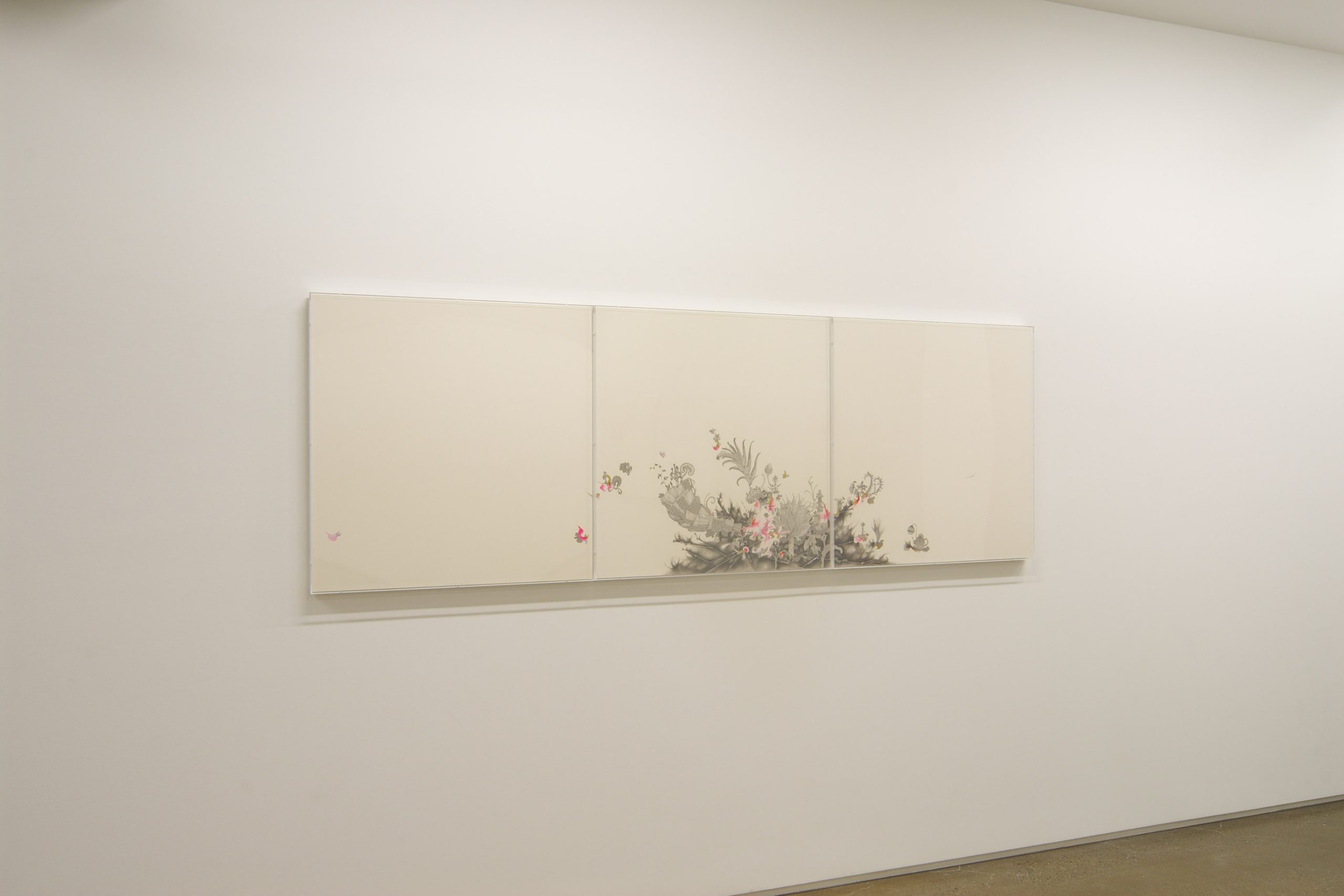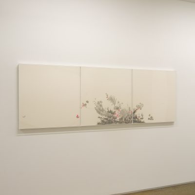 佐伯洋江は1978年大阪に生まれ、現在は京都を拠点に制作を続けています。初期から一貫してケント紙にシャープペンシルや鉛筆で描いてきた佐伯の作品群は、この数年の間に150点を超え、その表現世界は花鳥風月など自然を連想させるモチーフから新たな展開を見せています。ギャラリーでは2回目の個展となる本展には、横幅が3メートルを超える4点組の大型作品が出品されるなど、ギャラリースペースの空間と呼応した大小様々な新作が並びます。