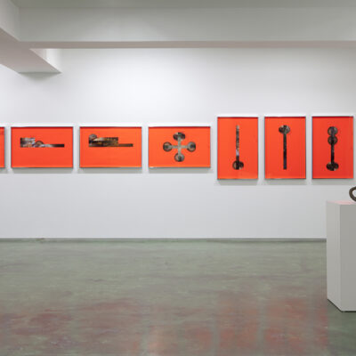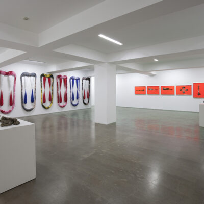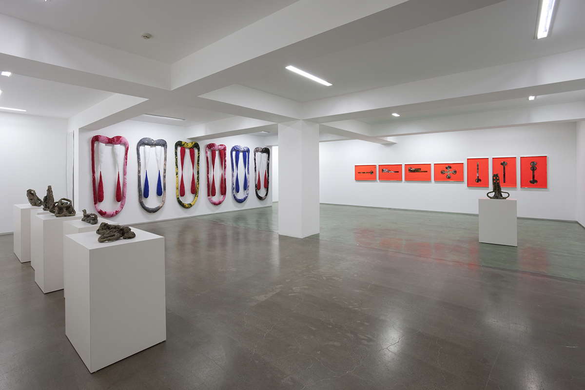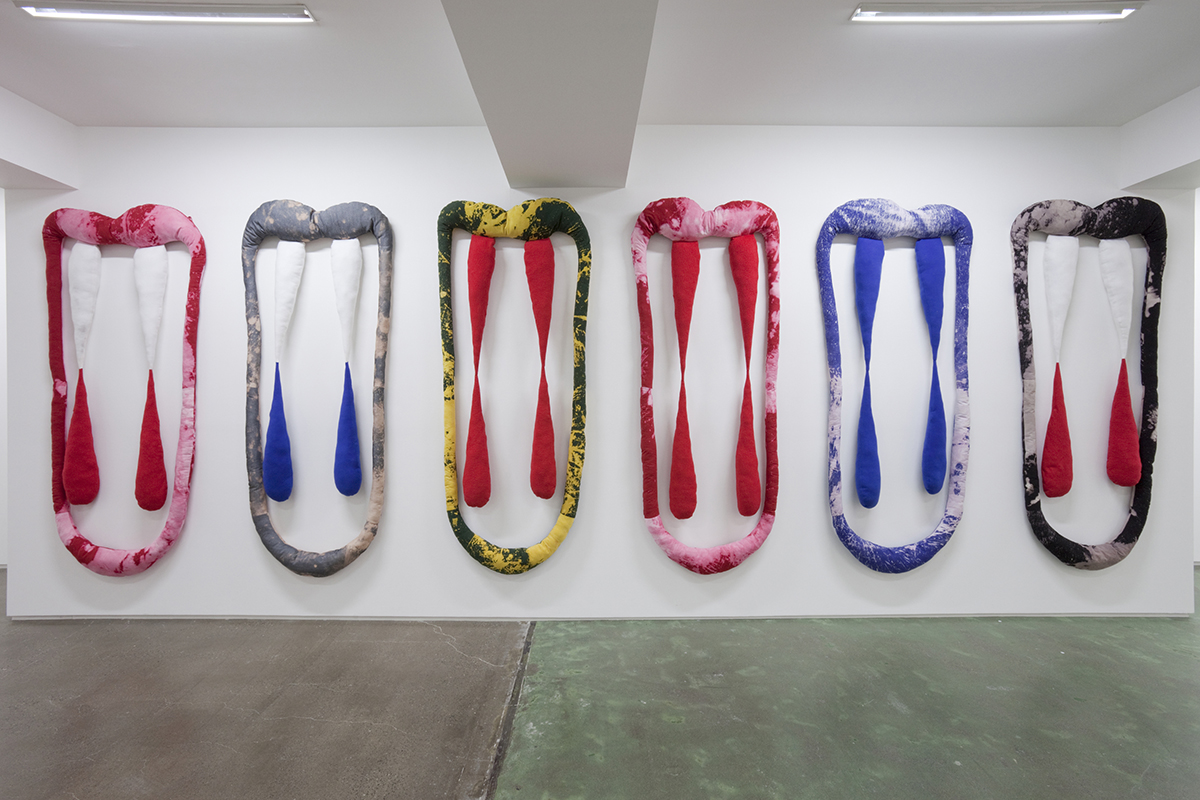 今回展示される新作群は、台座上に置かれたブロンズ作品、フレームに収められた鮮やかなオレンジ色の紙の上にコラージュを施した作品、吸血鬼の口をモチーフとしたソフト・スカルプチャー、そしてルビーの代名詞である部分的に漂白した布によって制作された、中央部にまるで渦のような空間を穿った正方形作品です。今インスタレーションの反復的・模倣的な構成の視覚的手掛かりとして、ルビーはキルト工芸を参考としています。直線的かつ幾何学的な作品の設置には、各作品群に垣間見る事が出来る反復的模様(反復される要素)を強調する意図が存在します。また、展示作品はブロンズやコラージュといった伝統的な美術作品制作のための素材と、ソフト・スカルプチャーと正方形作品に用いられた、ありふれた工芸素材とが合わせて展示されます。