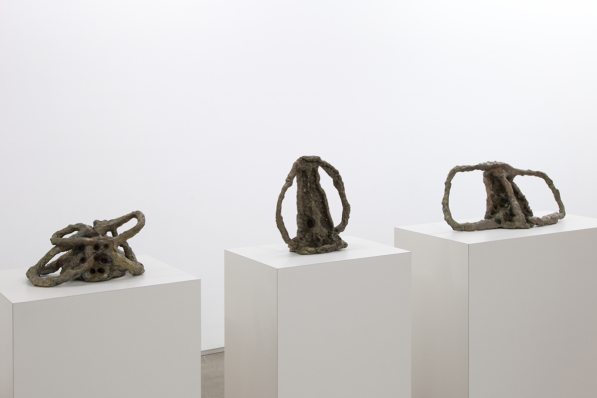 「HEAD TREKKERS」と題名されたコラージュのシリーズにおいて、深い宇宙のイメージは惑星に似た人間の頭蓋骨と並置されます。このコラージュの配置からは、宇宙に至るような幻覚体験と抗えない死のヴィジョンが呼び起こされます。「SOFT VORTEX」のシリーズも宇宙的な描写を用いおり、虚空を認識することを嘆いたポスト・ミニマリストのタペストリーに類似しています。ブロンズ作品群はルビーのセラミック作品と強く関連するもので、これらもまた美術治療法の心理学的要素を色濃く内包しており、固形化以前の素材の鍛造性の遺物なのです。「VAMPIRES」は血の滴る牙が生えた口が浮遊するファブリック作品です。このぽっかりと開いた口腔はルビーの「消費」への関心を掻きたて、「アートは解放を求める循環的な試みである」という自身の考えを表現しているのです。