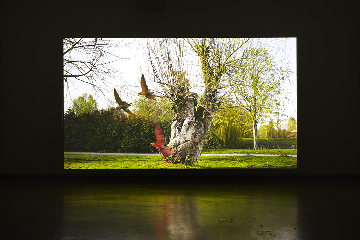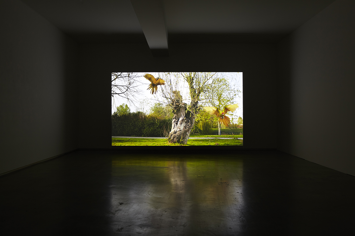 タカ・イシイギャラリーは、アムステルダムを拠点に活躍するマライケ・ファンヴァルメルダムのギャラリー初個展を開催いたします。明快かつ透明感溢れるループ映像作品で知られるファンヴァルメルダムの出展作「Face to face」は、コンゴウインコの群れが一本の木の周りを飛び、まるで鳥たちがこの木に強く惹きつけられているかのようです。木の幹がまるで類人猿の顔のように見えるため、鳥たちは集まるのでしょうか。群れの中の一羽が木の顎あたりに留まり、目のような幹の節を凝視することから、そのように解釈するかもしれませんが、はたしてそのとおりなのでしょうか。