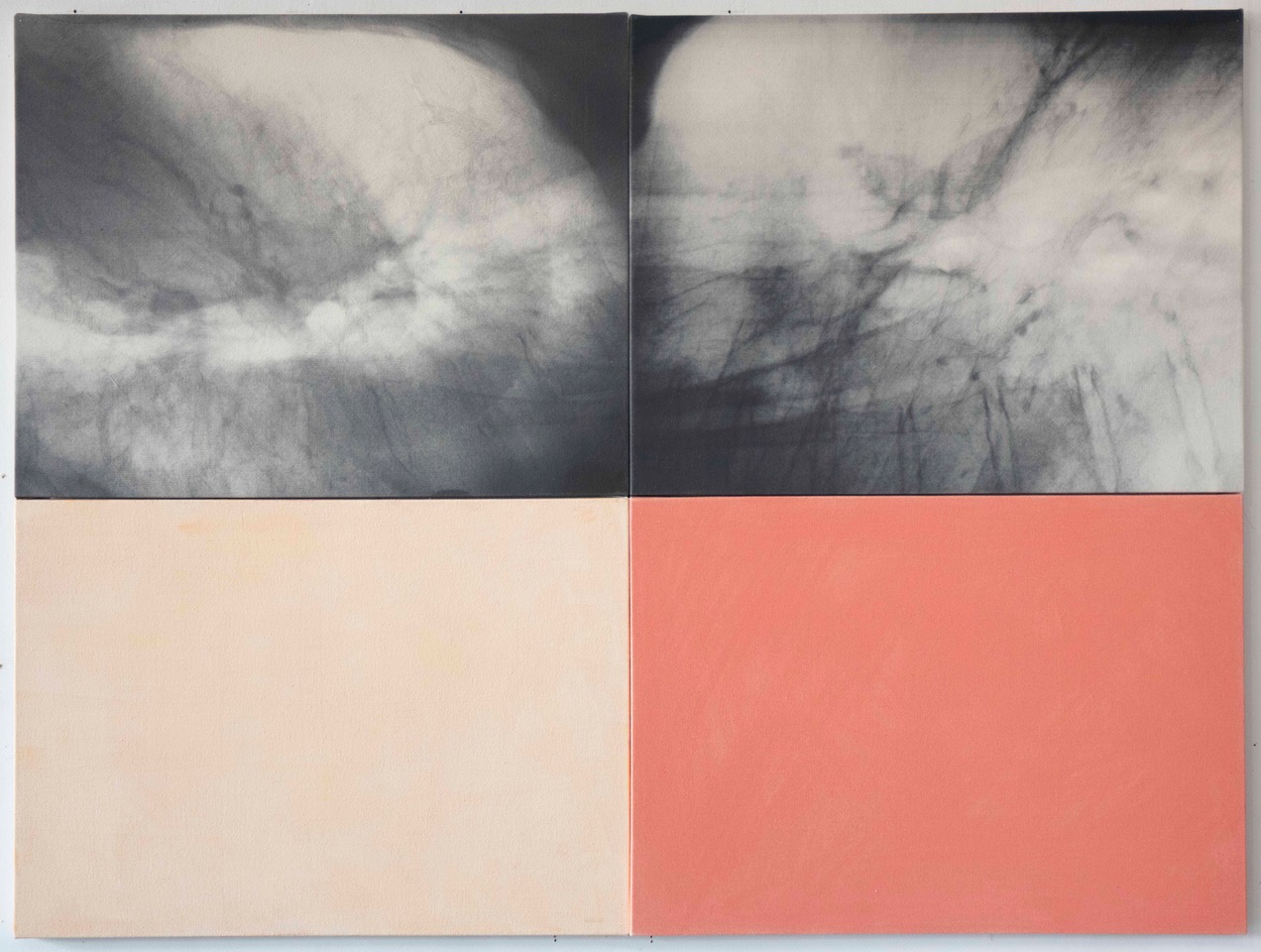 六本木会場では、彼女がシカゴ美術館附属美術大学在学中に制作した《Cko》シリーズ(1966~1967年)を紹介します。この初期代表作は、彼女の芸術的探求の原点であり、異文化の中で感じた孤独や疎外感と向き合う中で生まれました。魚眼レンズを用いてヌードモデルを撮影し、カラーとモノクロのネガを重ねることで、被写体を歪め、再構成された像が生み出されています。ソラリゼーションやネガへの漂白剤の筆塗りなど、意図的操作と偶然性を融合させた実験的な手法も、このシリーズの大きな特徴です。すでにここに、のちのフォトペインティングやフォトグラム、X線写真シリーズへとつながる、メディアの境界を越える姿勢が芽生えていることがうかがえます。「Untitled 3」(1970年)は、《フォトキャンバス》と呼ばれるシリーズ(1968〜1972年)で、作家自身が写真乳剤を塗布し、撮影したネガを暗室で露光し、現像したキャンバスにグラファイトで加筆した、写真・絵画が融合した表現が展開されます。会場には新作として1990年代から2000年代にかけて取り組まれたX線写真シリーズと融合した、「Fever」(2021年)、「Nina’s Pelvis & Leg」(2024年)、そして「Oral」(2022年)を紹介します。医療用ネガを素材とし、異なる出自のキャンバスからなる構成になっています。これらの作品群は、視覚芸術と科学の境界を探求すると同時に、人体の内部構造を詩的かつ象徴的に表現し、生命の神秘や脆さを鮮やかに可視化しています。