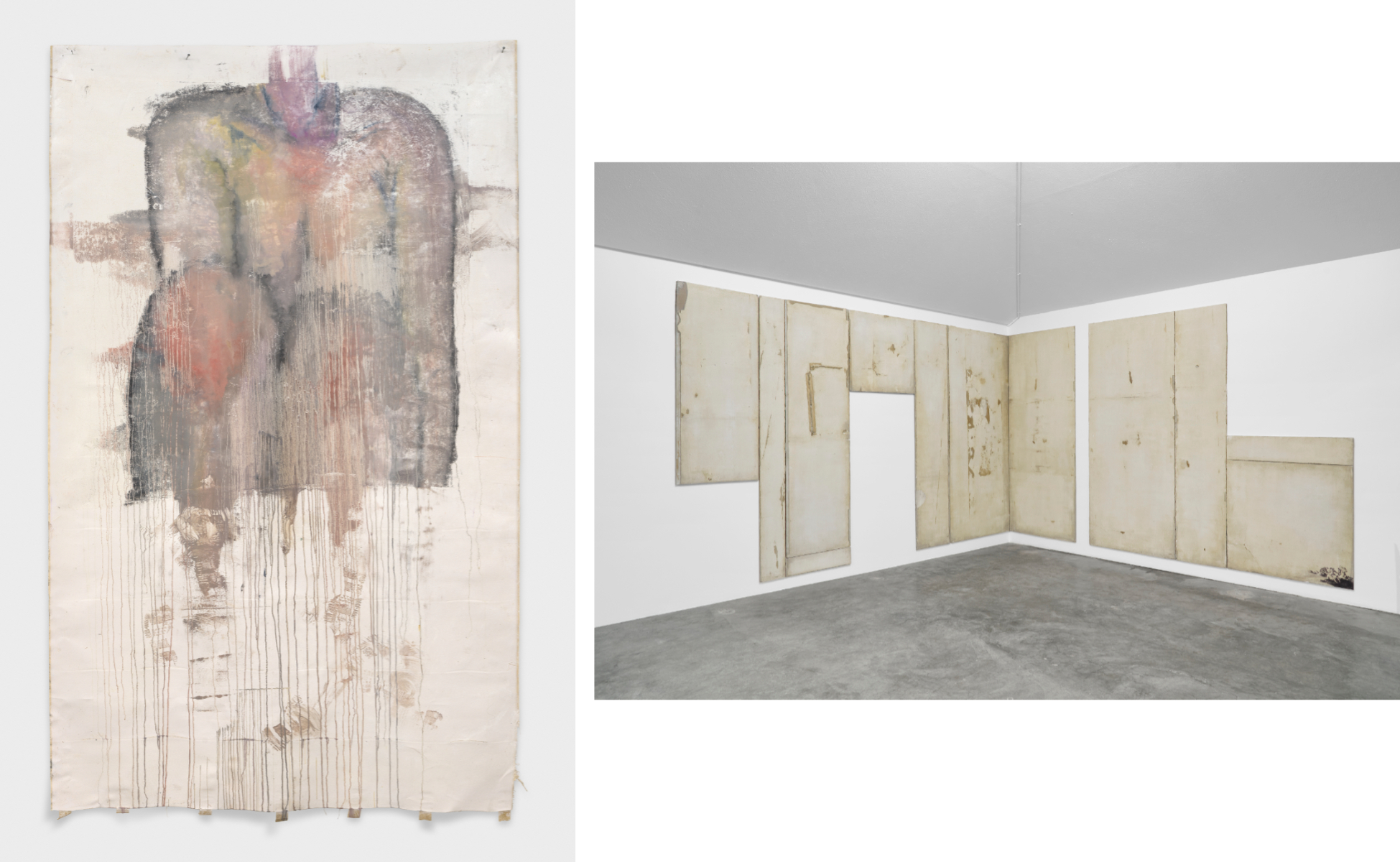 セルパスは、キャンバスの絵の具が乾かないうちに上から別のキャンバスを重ねて押さえつけ、一緒にロール状に巻いたのち、また別々に離すという工程を踏みます。ここでは一方の面上から他方の画面へ絵の具が移り、跡が現れます。画面の痕跡は複写のように残されていきますが、全く同じ図像の反復があらわれることはありません。そのわずかに変化しながら似た事象が繰り返し発生するという現象は、時間の推移や人の手の介入によってあらゆる物事が変化していくさまを追随するものです。